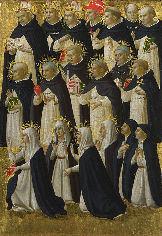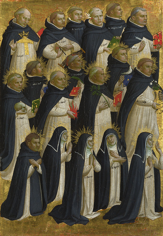 Originally, and as is shown below, these two panels ‘bookended’ the predella of the San Domenico Altarpiece, which the Dominican friar, Fra Angelico, painted for the recently founded Dominican Priory in Fiesole. Although they are quite small (c. 32X22cm), and at the base of the altarpiece, these two panels in black, white and gold, must have been eye-catching. The whole predella is filled with angels, prophets and saints, each painted in exquisite detail. The prophets and saints can be identified by their attributes. The Dominicans on either side are called blessed because they have yet to be canonised but were revered as holy. This is why they have rays rather than halos. For most of them Fra Angelico has written their names on their habits and many have an attribute indicating their particular path to holiness in this life. For example, you can see that some of them were bishops and that one was a cardinal. One of them, Jordan of Saxony, has no rays because he wasn’t yet beatified. On the bottom row, all the figures are kneeling. These are other members of the Dominican family. On the far left, there is a lay brother with his distinctive black scapular and beside him four nuns, who are dressed like the friars, but wear a black veil rather than the friars’ capuce. On the right, are six lay Dominicans. The four women wear white veils. One of them is St Catherine of Siena who holds her book. She would be canonised in 1461. The two male figures on the far right do not have rays, but they may be patrons. The nuns and lay Dominicans kneeling at the very bottom of the panels suggest that their prayer is the foundation of the mission of the whole Order. We celebrate Dominican All Saints on Friday and Dominican All Souls’ on Saturday. All Dominican saints pray for us.